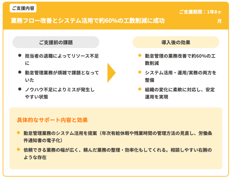 労務代行サービス「まるごと管理部(労務プラン)」を導入し、勤怠管理業務を効率化した事例を紹介します。