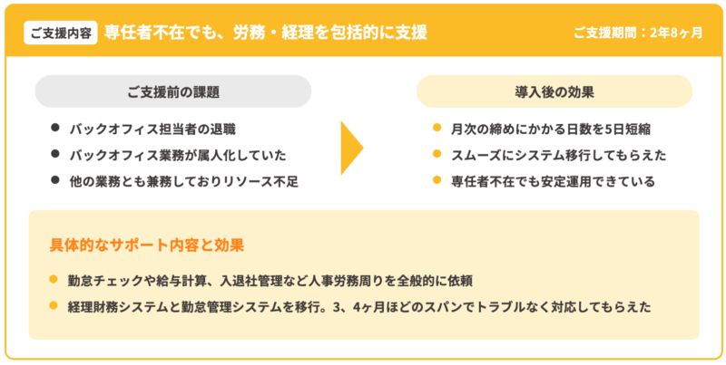 勤怠データの集計、残業時間のチェック、法改正への対応などを代行してもらえるため、担当者の負担を大幅に減らせます。
